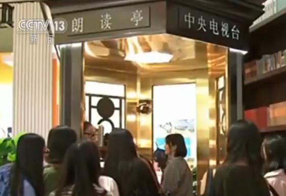 在展廳,中央電視臺《朗讀者》欄目的線下體驗專區“朗讀亭”外每天都會排起長隊。