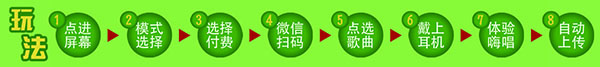 微信掃描登錄機器→觸摸屏點歌→戴耳機演唱→錄音后微信分享